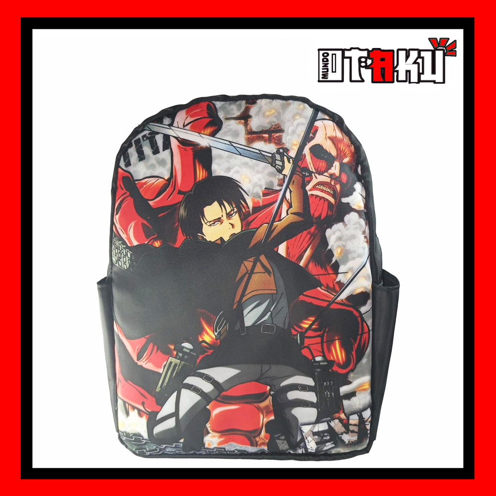 En primer lugar, el arte frontal resalta a Levi Ackerman en acción, capturando su carácter frío, preciso y letal. Además, se muestra al Titán Colosal, creando un contraste visual impresionante que remite a los momentos más épicos y devastadores de la serie. Esta combinación convierte al bolso en una pieza narrativa que cuenta una historia desde cualquier ángulo.