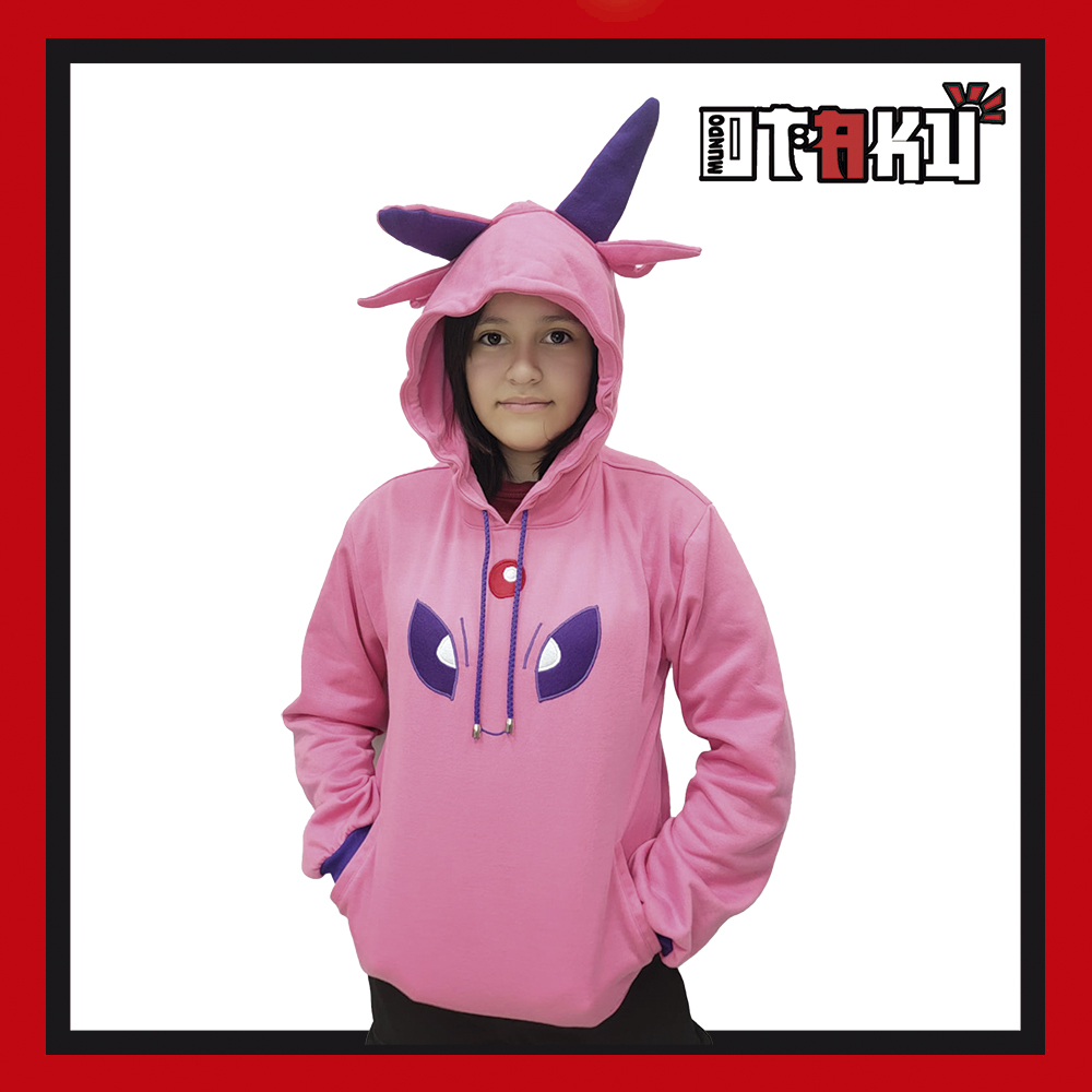 El diseño del buzo es lo que realmente lo hace especial: en la parte frontal, el rostro de Espeon está bordado con gran detalle, reflejando toda la elegancia y el estilo de este Pokémon evolucionado de Eevee. Además, la capucha incorpora orejas y detalles característicos de Espeon, lo que convierte esta prenda en una recreación divertida y original de su apariencia. Cada elemento está pensado para resaltar tu amor por la saga y diferenciar tu outfit con un toque único.