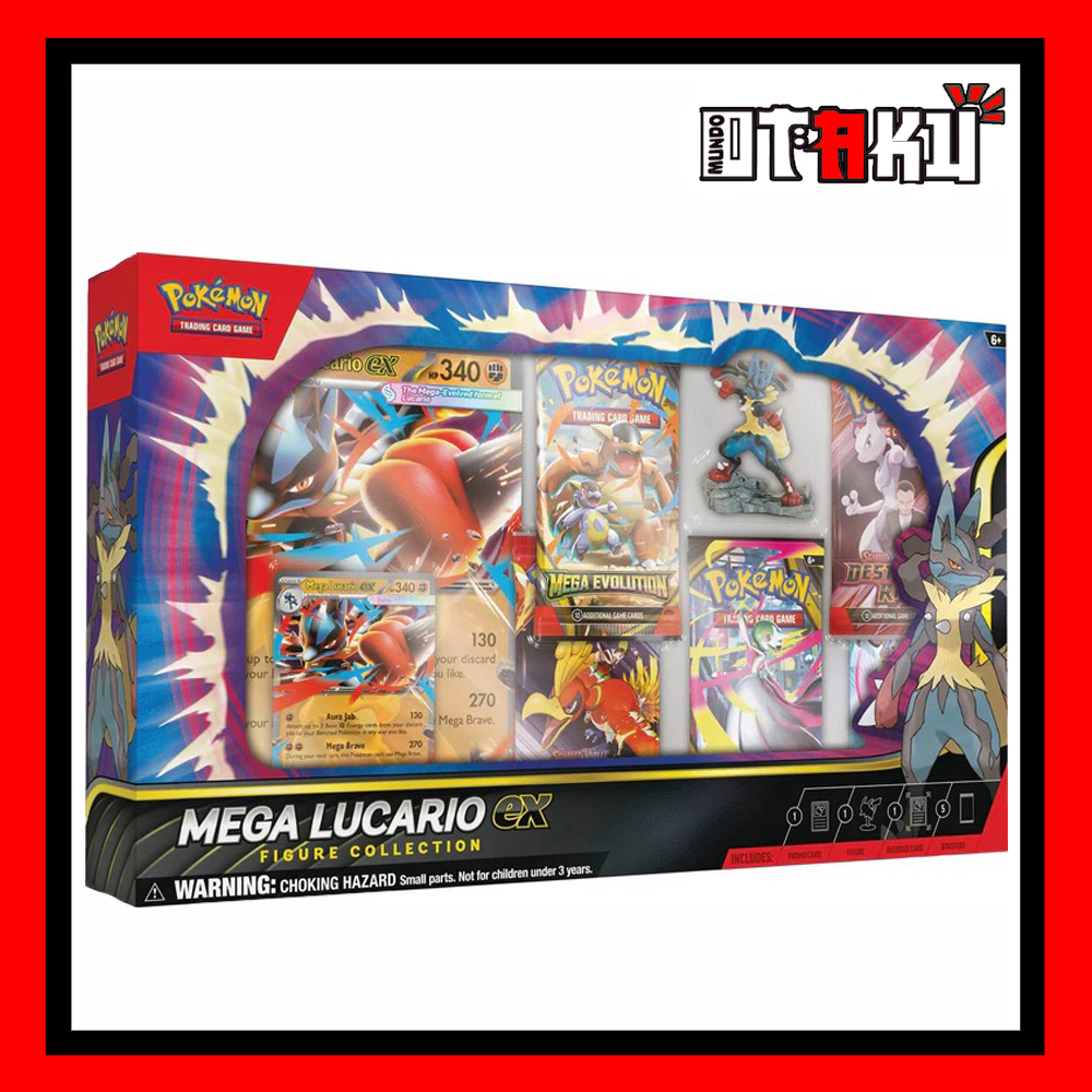 Además, esta colección destaca por su presentación premium, ya que incluye una impresionante carta promocional laminada grabada de Mega Lucario ex, perfecta para resaltar en cualquier colección. Asimismo, contiene una carta promocional de gran tamaño que no solo luce increíble, sino que también se convierte en un elemento decorativo ideal para espacios gamer, vitrinas o zonas temáticas. Por otro lado, la figura de Mega Lucario captura su fuerza, su aura y su estilo de combate con un diseño dinámico y detallado que transmite toda su esencia.