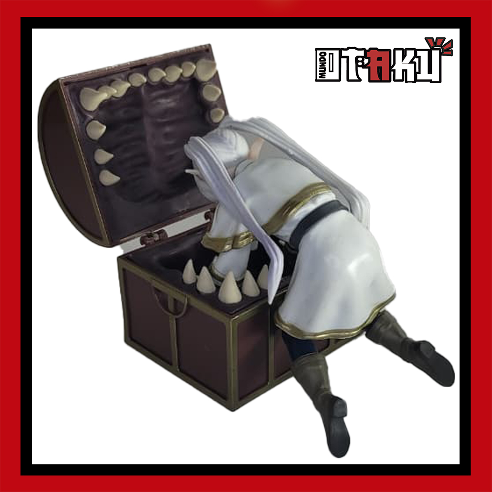 El diseño destaca por su increíble nivel de detalle: el cofre con su apariencia engañosa listo para atacar, y Frieren atrapada en plena escena, creando una composición dinámica que transmite movimiento y personalidad. Es una figura que no solo decora, sino que cuenta una historia, convirtiéndose en un punto de conversación para cualquier fan del anime.